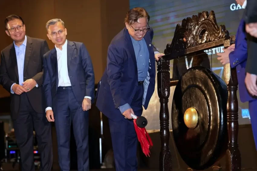 Sarawak Premier Tan Sri Abang Johari Tun Openghits a gong to launch the Asia Pacific Cybersecurity Conference 2023 on Friday. Second from left is Communications and Digital Minister Fahmi Fadzil.