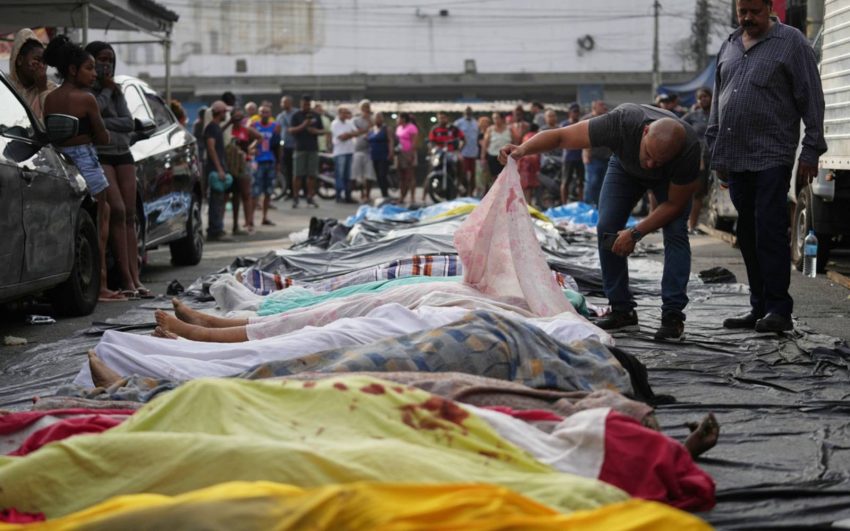 Civil police secretary Felipe Curi meanwhile alleged the bodies displayed in the street were in their underwear because they had been stripped by residents of the “camouflage clothing, vests, and weapons” they had on them.