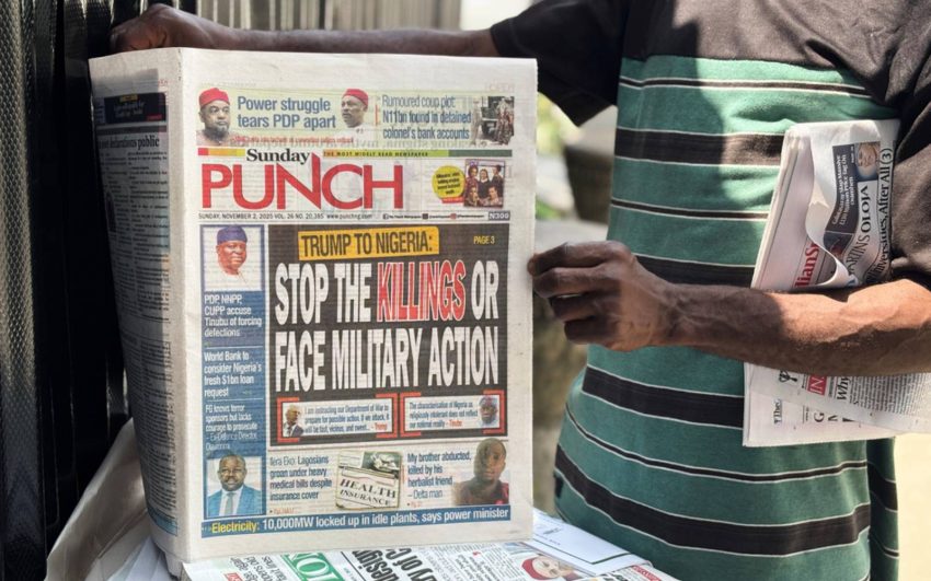 A vendor sells local newspapers featuring headlines about US President Donald Trump’s comments on Nigeria on the streets of Lagos. (AP pic)