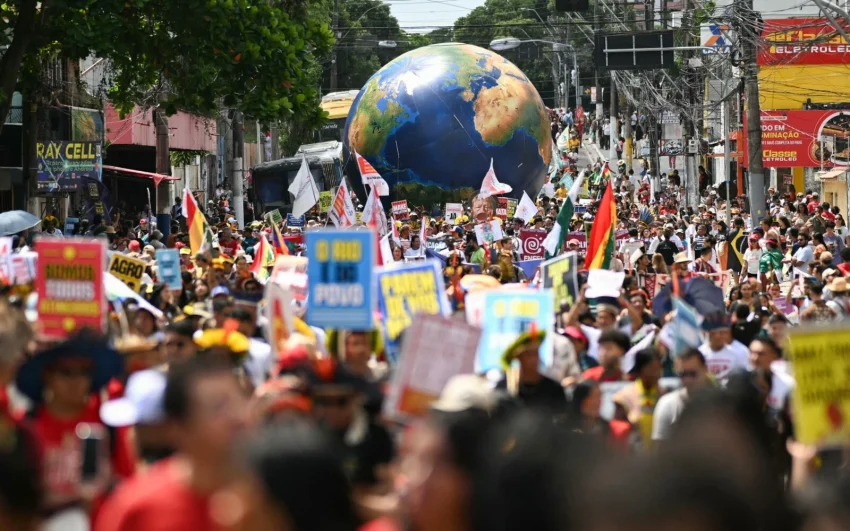 Called the “Great People’s March” by organisers, the Belem rally comes at the halfway point of contentious negotiations and follows two Indigenous-led protests that disrupted proceedings earlier in the week.