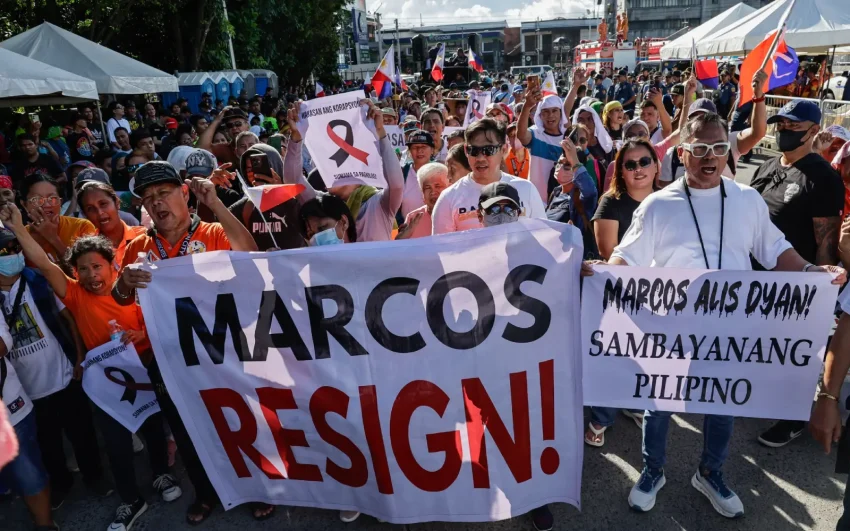 A concurrent rally led by supporters of the Duterte family and explicitly calling for Marcos’s resignation drew an estimated 2,000 people.