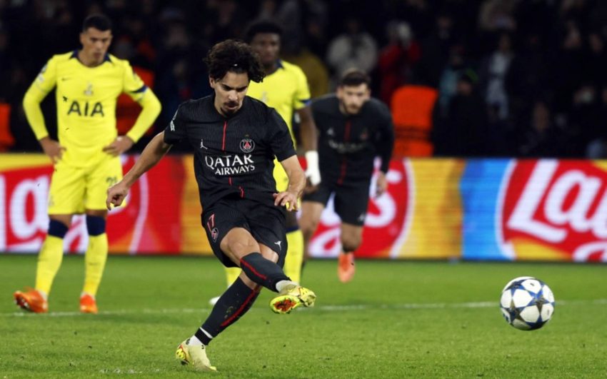 PSG’s Vitinha slots home a penalty for the fifth goal in the win against Tottenham Hotspur at Parc des Princes. (EPA Images pic)