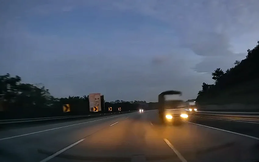 A screenshot of a highway user’s dashcam video shared online in which the driver can be seen narrowly avoiding the oncoming lorry.