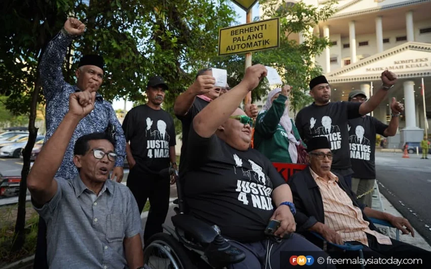 The supporters had gathered as early as 7am, chanting slogans such as “Justice for Najib”, “Free Bossku” and “Lawan tetap lawan (The fight must go on)”.