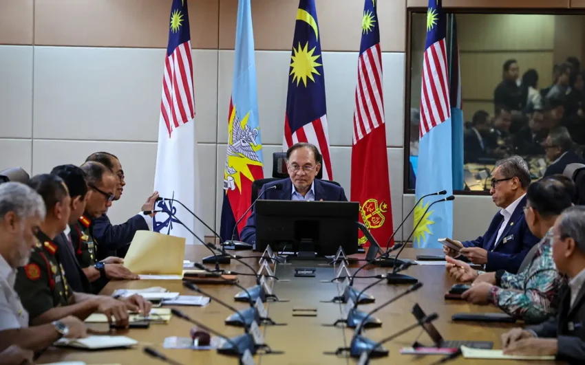 Perdana Menteri Anwar Ibrahim dalam pertemuan bersama pimpinan tertinggi Kementerian Pertahanan dan ATM di Wisma Perwira, hari ini. (Gambar Bernama)
