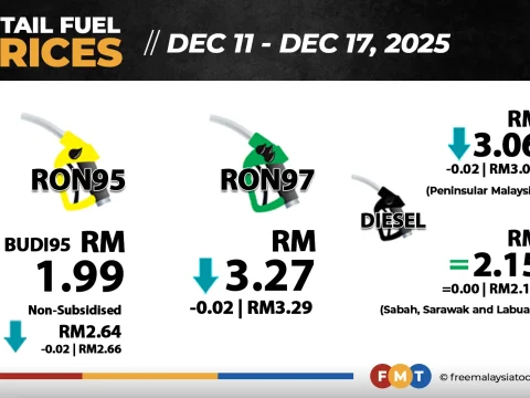Non-subsidised RON95, RON97, diesel prices down 2 sen