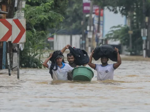 Sri Lankan flood victims wade through a flooded road during heavy rainfall in a suburb of Colombo. (EPA Images pic)…
