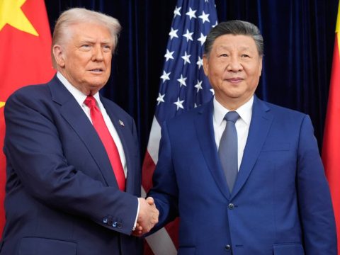 President Donald Trump and Chinese President Xi Jinping exchange greetings ahead of their meeting in Busan, South Korea. (AP pic)…