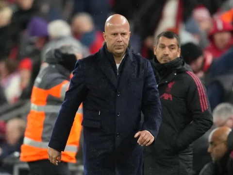 Liverpool’s manager Arne Slot walks off the pitch after the English League Cup fourth-round match against Crystal Palace. (AP pic)…