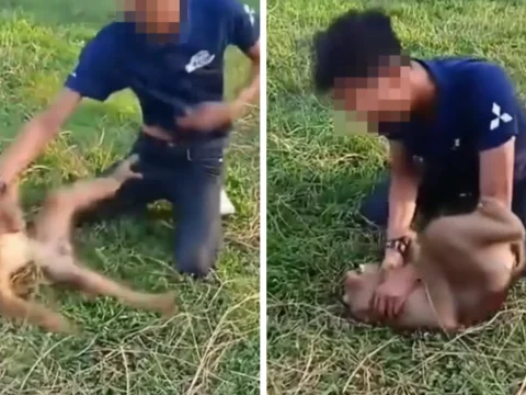 Screenshots from a viral video showing a man slapping and hitting the monkey multiple times as it struggled to get…