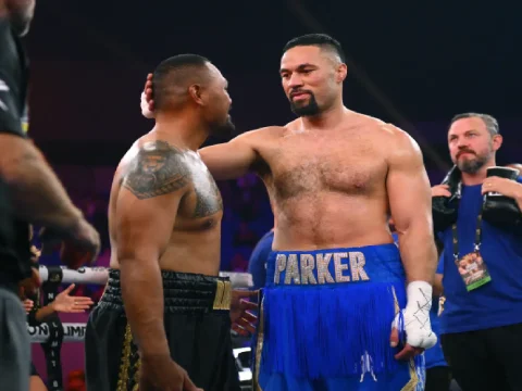 A 2023 file photo of Joseph Parker (right) with Australia’s Faiga Opelu after winning their heavyweight bout in Melbourne. (EPA…