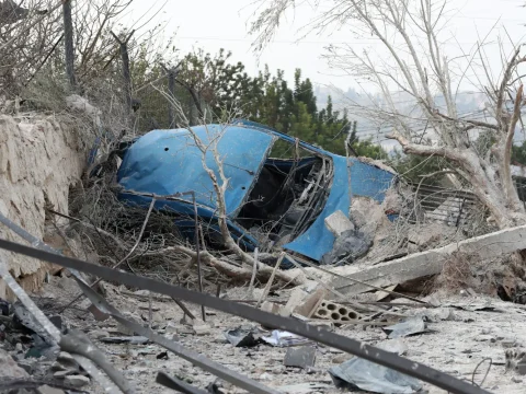 A damaged car lies amid the rubble at the site targeted by an Israeli airstrike in the town of Mansouri,…