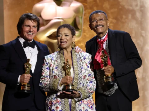 Tom Cruise (left) poses with his honorary Oscar alongside fellow honorees Debbie Allen (centre) and Wynn Thomas (right) during the…