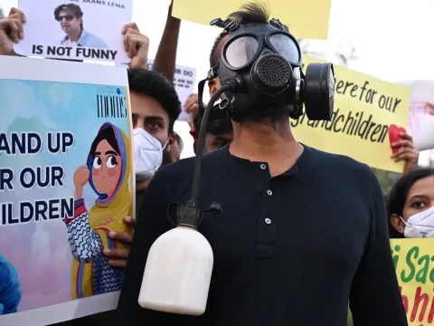 Demonstrators wearing masks hold posters during a protest demanding the government take action to reduce air pollution in New Delhi….