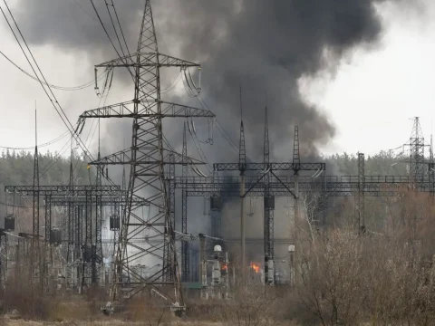Smoke rises at the scene of a missile strike on high-voltage lines in the city of Kharkiv. (EPA Images pic)…