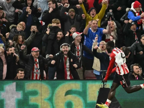 Sunderland’s Dutch striker Brian Brobbey celebrates after scoring their second goal to make it 2-2 against Arsenal in the Premier…