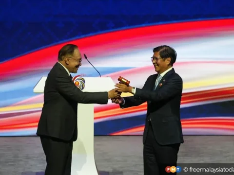 Philippine president Ferdinand Marcos Jr receiving the Asean chairmanship gavel from Prime Minister Anwar Ibrahim at the closing ceremony of…