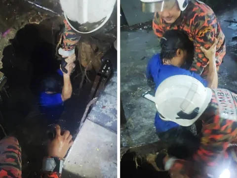 Firefighters extricating the victim from the sinkhole in Ara Damansara this evening. PETALING JAYA: A man was injured after falling…