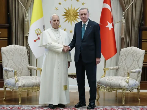 Pope Leo XIV meets Turkish President Recep Tayyip Erdogan during his first trip outside Italy as pontiff. (Turkish Presidential Press…